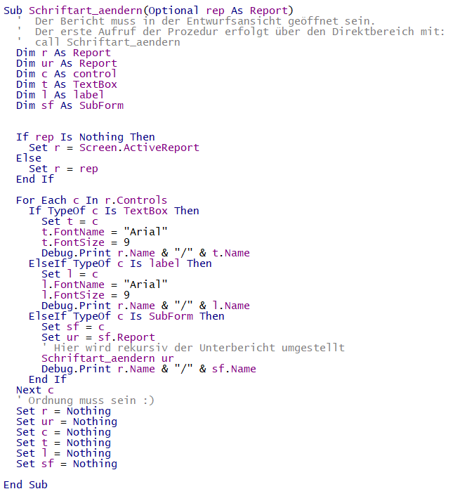 Wie ändere ich möglichst komfortabel die Schriftart und/ oder die Schriftgröße in einem Access-Bericht und seinen Unterberichten?